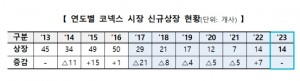 한국거래소는 올해 코넥스시장에 14개사가 새롭게 진입했다고 27일 밝혔다. 2021년 7개로 쪼그라들었던 신규 상장이 지난해(14개)에 이어 2년 연속 두자릿수를 기록했다.한국거래소는 신속 이전상장 트랙의 재무 요건을 완화하고, 이익 미실현 트랙을 신설하는 등 이전 상장 매력이 주목받으면서 신규 상장이 활성화했다고 분...